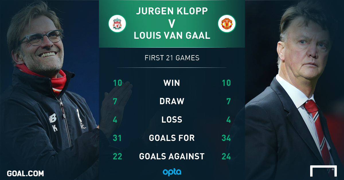 Jurgen Klopp has an almost identical record after 21 matches in charge of Liverpool as Louis van Gaal had at Manchester United.